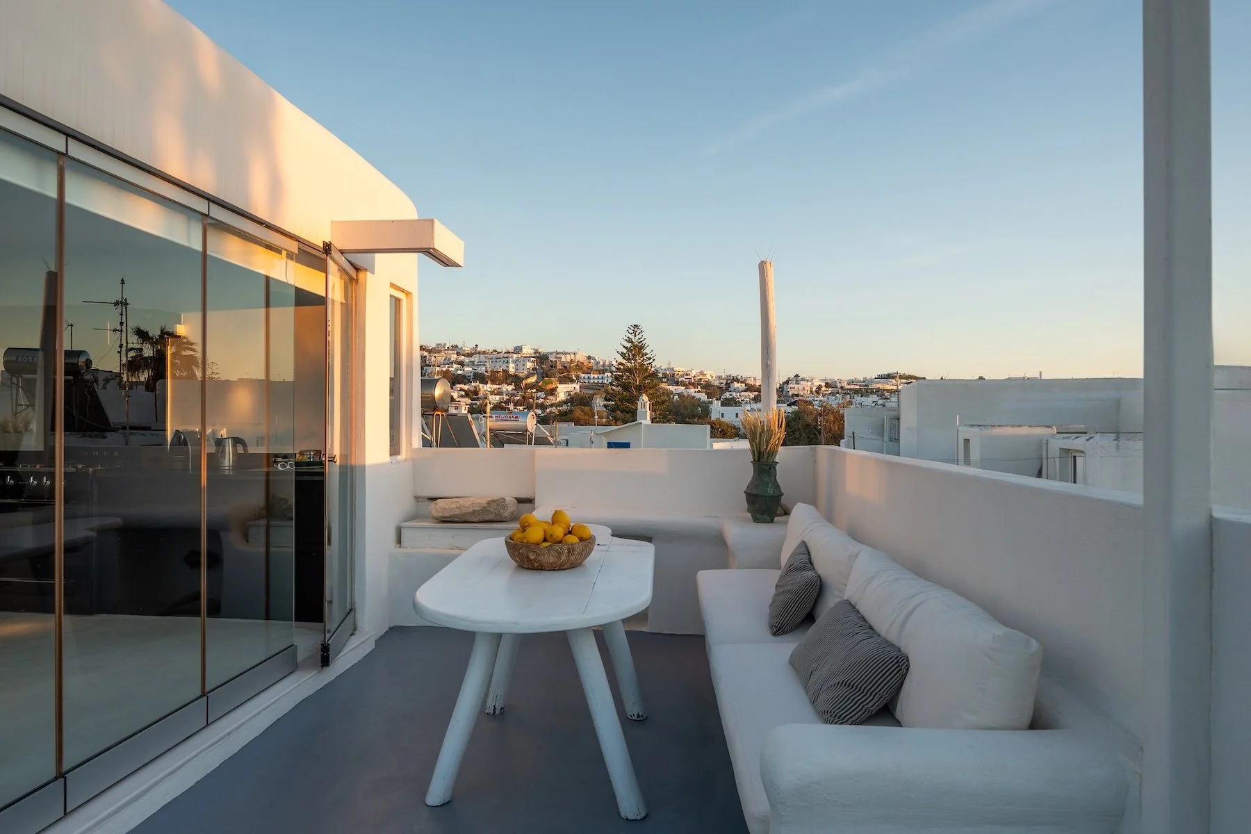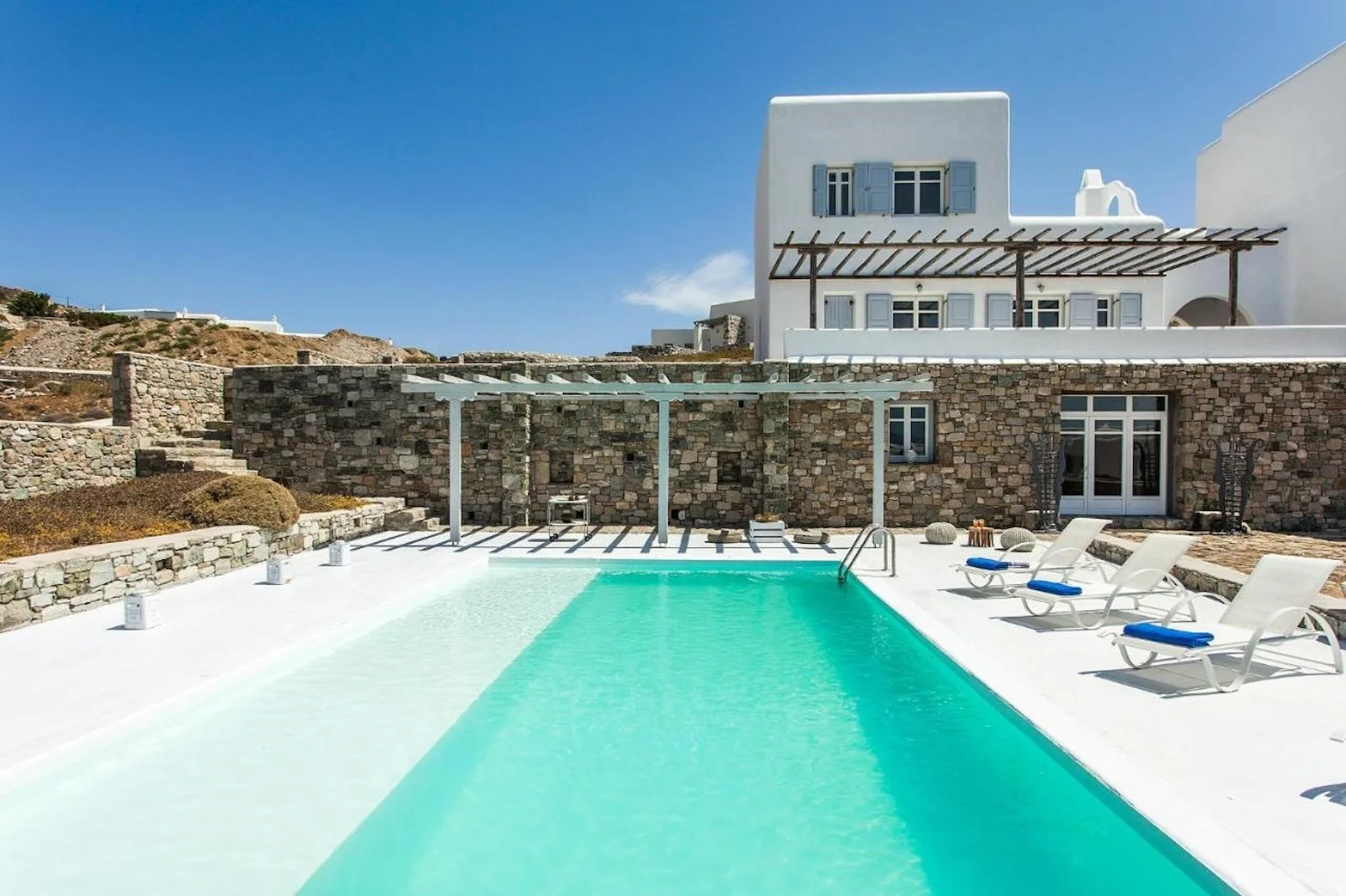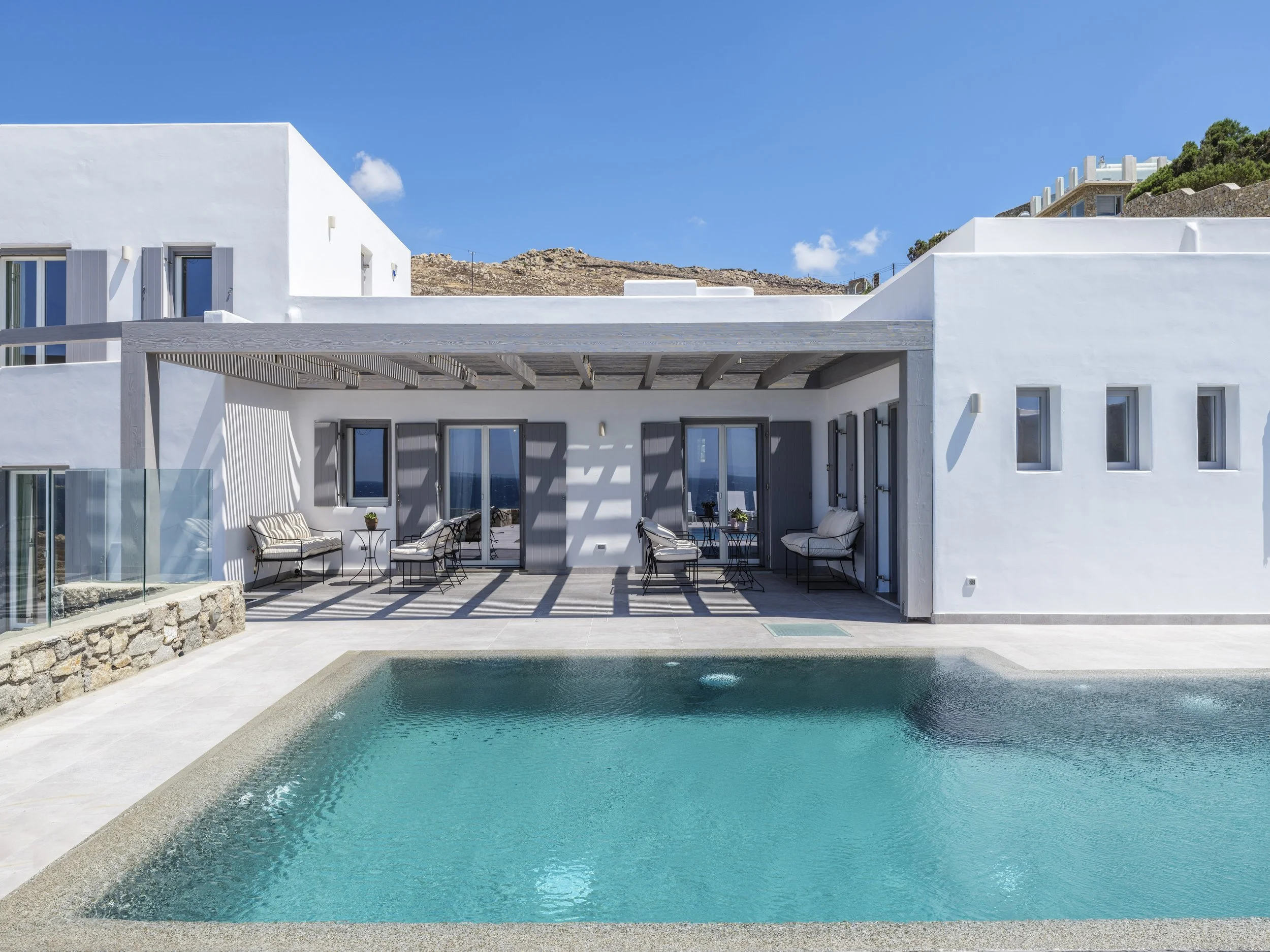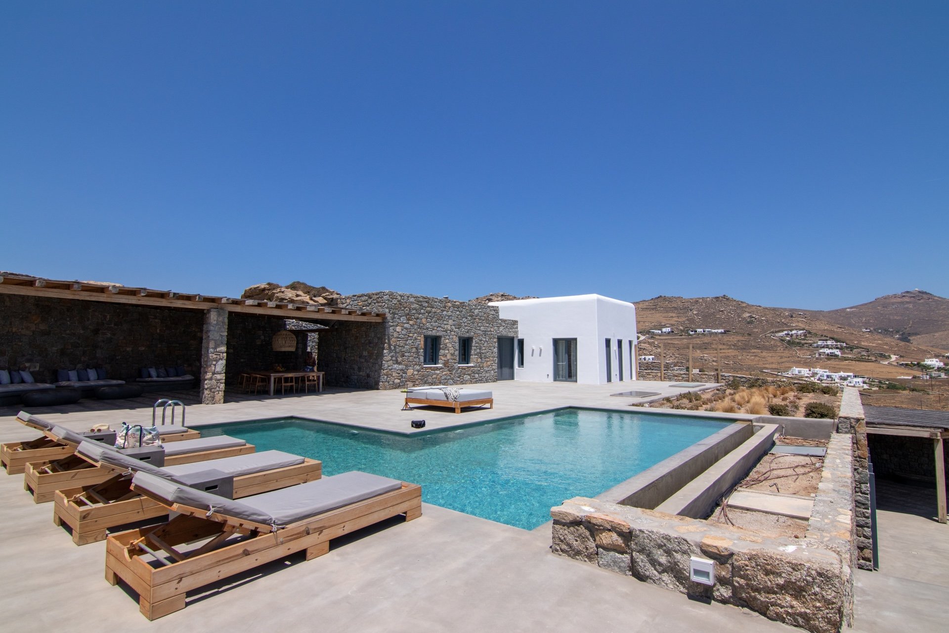 A stunning hillside villa graced with understated elegance, furnished in muted tones, warm woods, and local stone that combine to create a luxurious yet relaxed ambiance.Enjoy breakfast in a pergola-shaded lounge, indulge in fine dining on expansive terraces, or float dreamily in your fabulous infinity pool, where the cerulean sky seamlessly meets the sea.Spellbinding minimalist living and sleeping areas overlook the sun-drenched landscape of Mykonos. Breathtaking open skies, outdoor summer living, and an infinity pool to die for complete the experience.